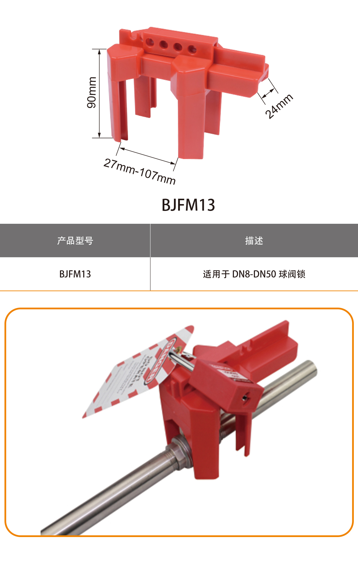 ◎ 由工程塑料ABS制成。◎ 小型鎖適用于在關(guān)閉狀態(tài)下管道直徑小于1.3cm-6.4cm的球閥,在閥門打開狀態(tài)下,可鎖定的范圍減小為1.3cm-4.3cm,中型鎖適用于在關(guān)閉狀態(tài)下管道直徑小于1.3cm-8cm的球閥,在閥門打開狀態(tài)下,可鎖定的范圍減小為1.3cm-6.5cm,大型鎖適用于5cm-20cm管道直徑的球閥。