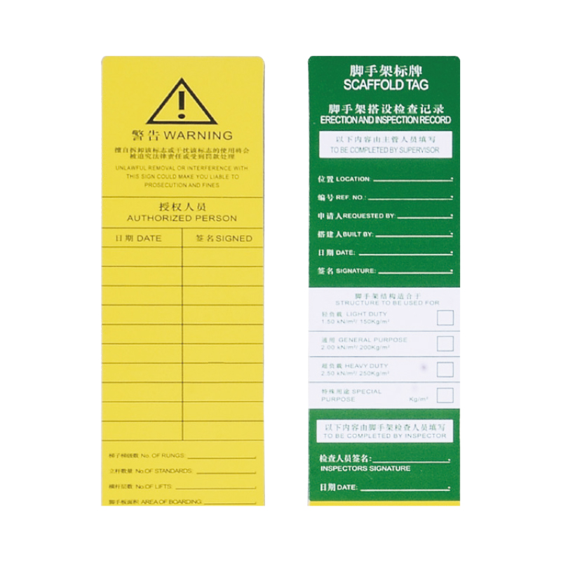 產(chǎn)品介紹:◎ 由工程塑料ABS制成。◎ 為工作場所上的腳手架提供系統(tǒng)、程序、規(guī)范的警示。◎ 提供清晰的檢查線索,以保證工作的安全性和完整性。◎ 標(biāo)簽上的書寫內(nèi)容含有三部分,可以提供高度視覺和醒目的信息。◎ 每個都含有一個腳手標(biāo)簽支架和一張標(biāo)簽,標(biāo)簽的內(nèi)容可以定制。