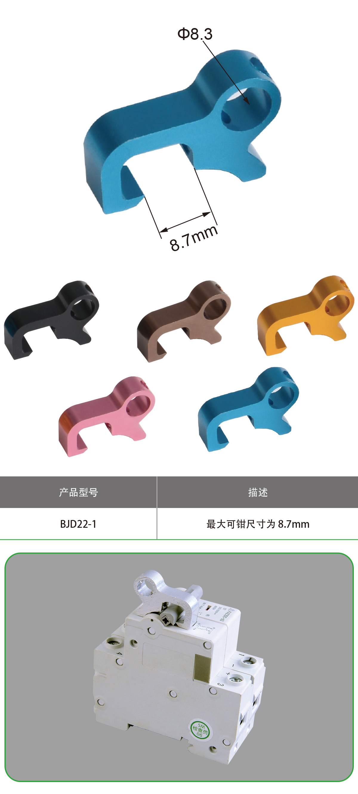 ◎ 由鋁合金制成,表面氧化處理,更耐腐蝕。◎ 適用于歐洲、亞洲大部分現(xiàn)有型號的小型短路器。◎ 使用時應(yīng)配合小型一字螺絲刀使用。◎ 鎖孔直徑8.3mm。◎ 適用于多極小型斷路器。