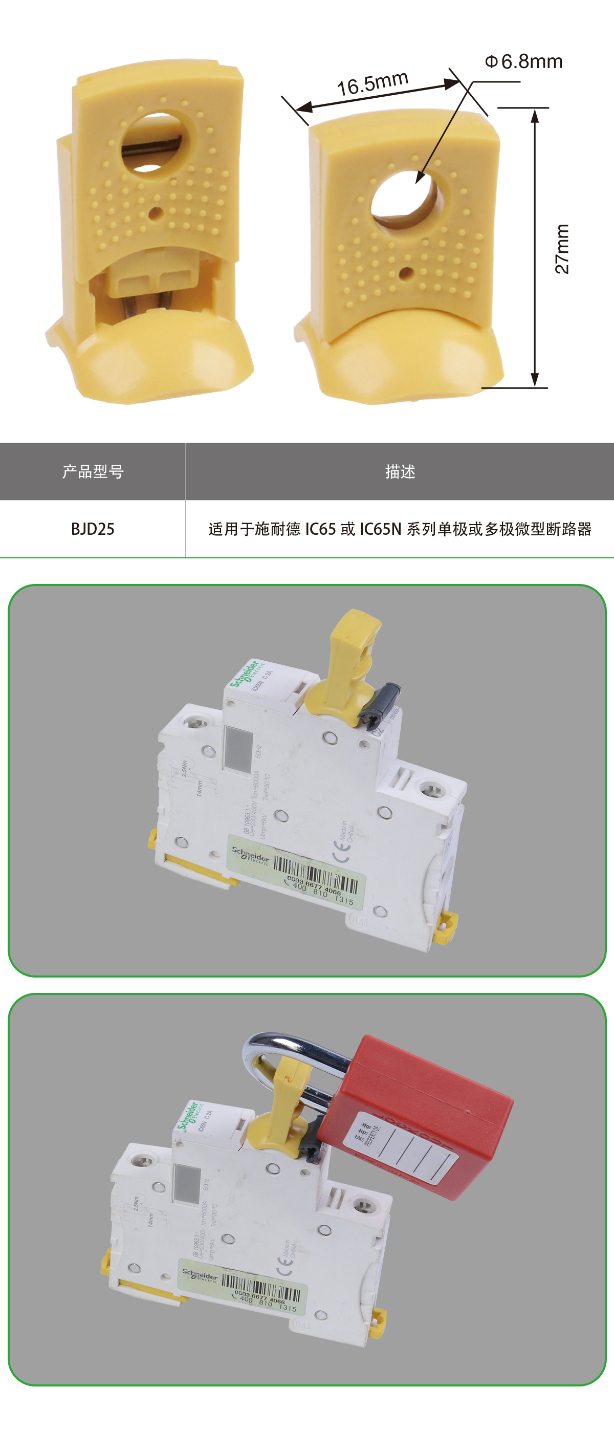 ◎ 采用ABS工程塑料制成。◎ 不需要任何其他的工具,即可輕松完成上鎖。◎ 鎖孔直徑6.8mm。◎ 用于鎖住施耐德專用斷路器,以防誤用誤觸。
