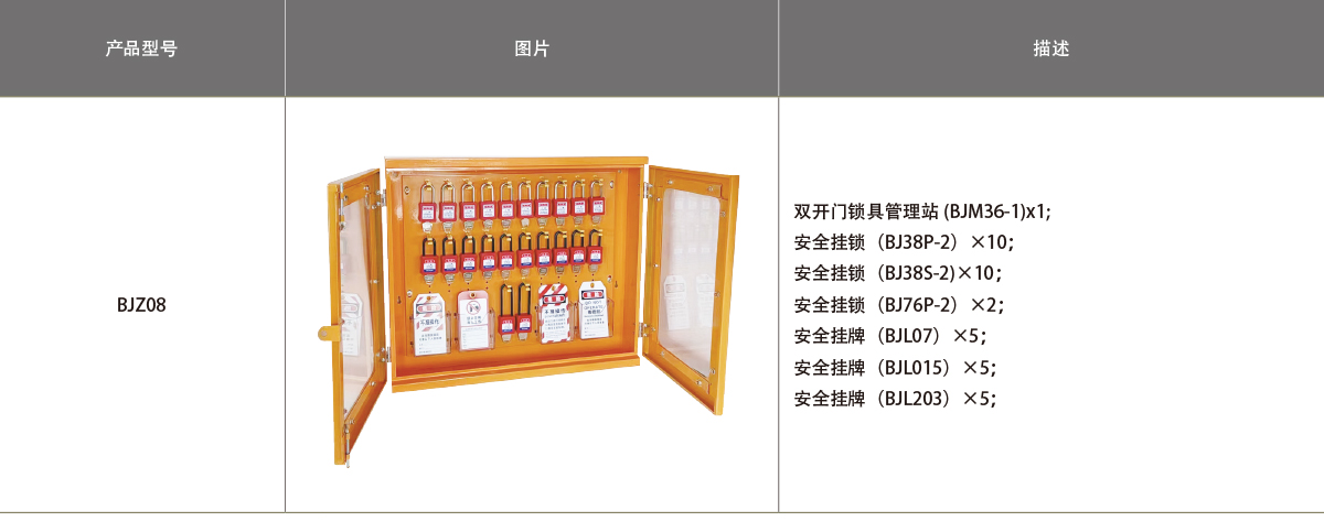 雙開(kāi)門(mén)鎖具管理站(BJM36-1)x1;安全掛鎖(BJ38P-2)×10;安全掛鎖(BJ38S-2)×10;安全掛鎖(BJ76P-2)×2;安全掛牌(BJL07)×5;安全掛牌(BJL015)×5;安全掛牌(BJL203)×5;