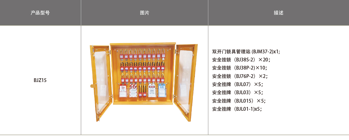 雙開門鎖具管理站(BJM37-2)x1;安全掛鎖(BJ38S-2)×20;安全掛鎖(BJ38P-2)×10;安全掛鎖(BJ76P-2)×2;安全掛牌(BJL07)×5;安全掛牌(BJL03)×5;安全掛牌(BJL015)×5;安全掛牌(BJL01-1)x5;