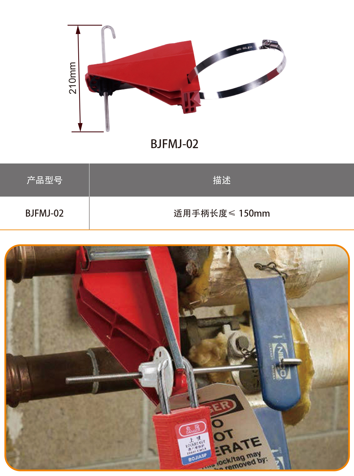 ◎ 鎖身由穩(wěn)定耐磨的鋅合金材質制成,表而由高溫噴塑處理; ◎ 用于鎖住關閉狀態(tài)下的工業(yè)球閥,以防誤用誤觸;◎ 上鎖鎖梁最大直徑:7mm;◎ 適用所有閥柄厚度≤10mm的球閥。